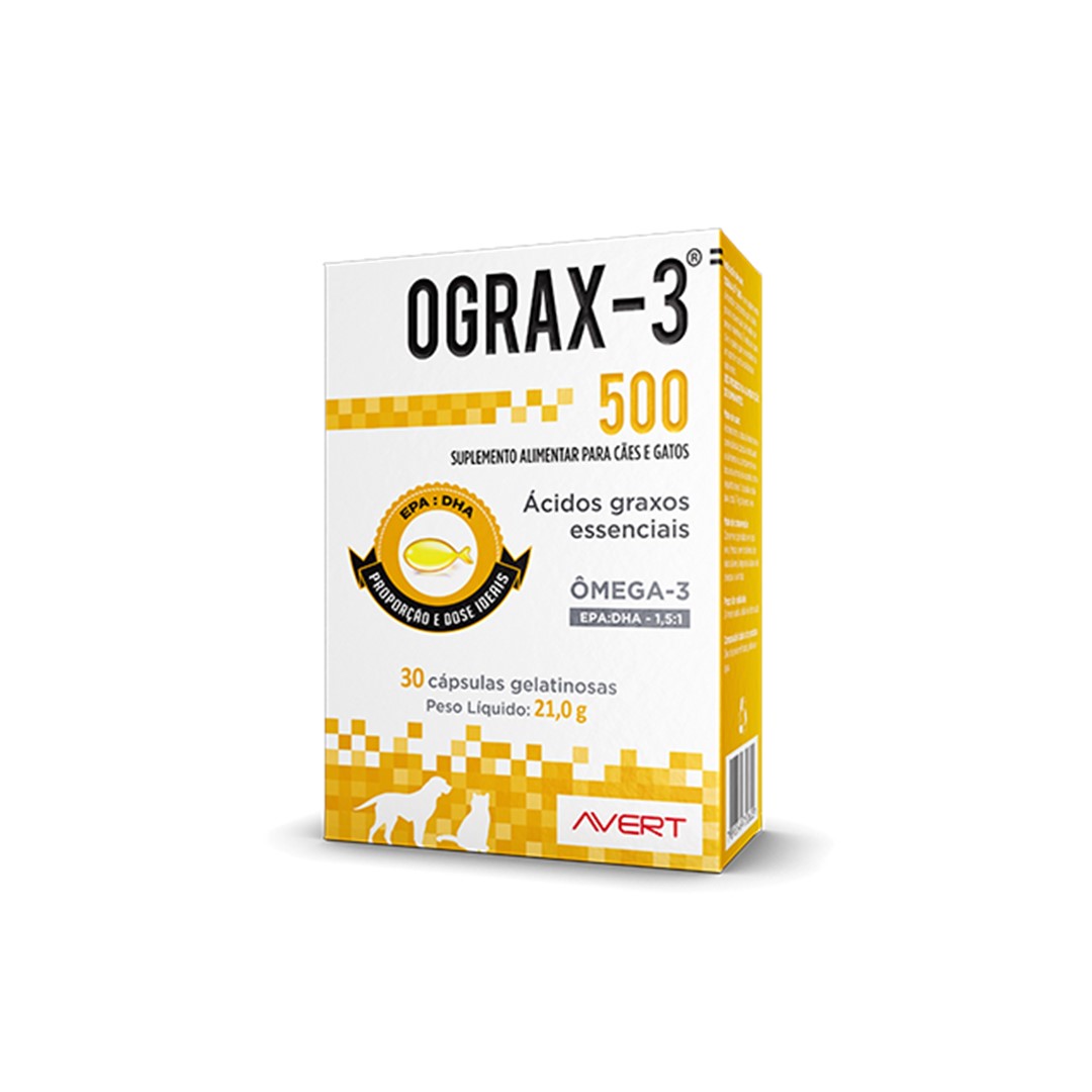 OGRAX-3 500 é um suplemento alimentar composto por ácidos graxos essenciais derivados de peixes marinhos. É indicado para cães e gatos que necessitem um aporte nutricional desses nutrientes.