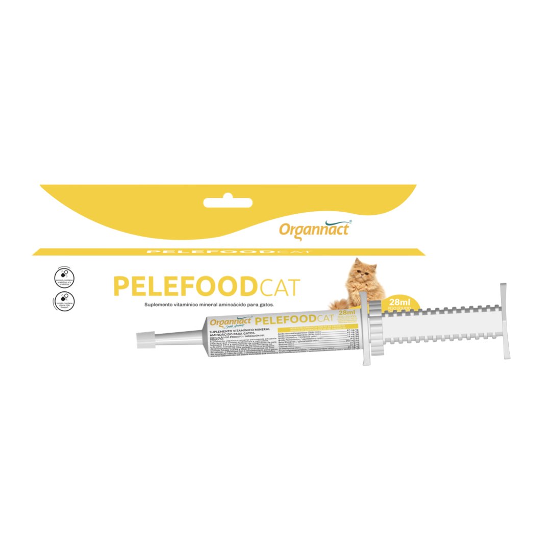 <p>Suplemento vitamínico mineral aminoácido em pasta palatável que contém prebióticos e nutrientes indicados para a manutenção da integridade da pele e do pelo, o produto auxilia de forma eficiente no desenvolvimento de uma pelagem forte e brilhante. Contém Ômega 3 (EPA e DHA) provenientes de óleo de salmão, o Pelefood Cat é recomendado para gatos em qualquer fase da vida | Contém: Óleo de salmão, óleo de soja refinado, spirulina desidratada, levedura seca de cana de açúcar, levedura seca de cervejaria, levedura inativada, amido de milho, água, biotina, niacina, vitamina A, vitamina E, ácido ascórbico, piridoxina, ácido pantotênico, zinco aminoácido quelato, DL-metionina, taurina, cistina, parede celular de levedura, inulina, hidrolisado de fígado de frango, glicerina, goma xantana, ácido cítrico, propilgalato, difosfato trissódico, ácido fosfórico, BHA (butil hidroxianisol).</p>